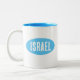 A light blue and white mug that says Israel. Mug design is inspired by the flag colours of Israel. עיצוב ספל קרמי