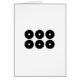 さなだろくもんせん/銭(ぜに)紋/呼称であるが、「平安紋鑑」「紋典」「家紋大図鑑」等では”真田銭”、「紋の志をり」「紋之泉」「日本の紋章」では”真田六文銭”、「定紋の研究」では”信濃真田六文連銭”、「家紋の事典」では”六連銭”としている。/無文銭:この図案のように四角い穴だけを入れた銭。(文字のあるものは”有文銭”)/無文銭では真田氏(信濃国松代藩)が特に有名で、その意味は死後に必要とされるという六道銭を意味している。六道とは地獄・餓鬼・畜生・修羅・人間・天上の六つの道で、それぞれの道に六道能化の地蔵がおり、六文の銭はその地蔵に渡す宝賽である。戦場に翻る六連銭は、持つ者には死を賭する覚悟を表し、見る者には地獄への渡し賃として恐れられた。(高澤等著「家紋の事典」より)/六連銭紋:これは仏教の六道銭からきている。六道とは地獄、餓鬼、畜生、修羅、人間、天上のこと。死者があの世に旅立つとき,ゼニ六文を棺に入れ、三途の川の渡り賃とし、地蔵尊に六道の往生を救ってもらう・・(丹羽基二著「家紋大図鑑」より)/真田幸村、真田信之がこの家紋。