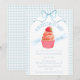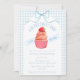 The heart of this baby shower invitation is a darling cupcake crowned with a sweet strawberry, set against a soft watercolor gingham backdrop and finished with a delicate bow.