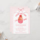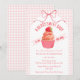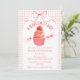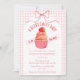 The heart of this baby shower invitation is a darling cupcake crowned with a sweet strawberry, set against a soft watercolor gingham backdrop and finished with a delicate bow.