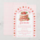 At the centre of this baby shower invitation is the sweetest strawberry shortcake, framed by a scalloped border sprinkled with tiny strawberries like little kisses of summer. Set against a soft watercolor gingham backdrop, the whole design feels light, nostalgic, and delightfully fresh.