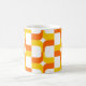 A bold geometric design made up of curved angle shapes in arranged in alternating directions with alternating colours.