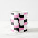 A bold geometric design made up of curved angle shapes in arranged in alternating directions with alternating colours.