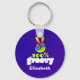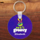 A trippy cool unique and personalised keychain with a typography design containing a rainbow peace sign with fingers raised up in a V. Text says 100% groovy in a funky font. Psychedelic hippie theme design. Set on a dark toned acid purple colour background.