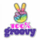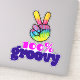 A vinyl decal with a trippy cool typography design containing a rainbow peace sign with fingers raised up in a V. Text says 100% groovy in a funky font. Psychedelic hippie theme design.