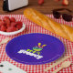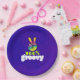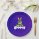 Trippy cool paper plates with a typography design containing a rainbow peace sign with fingers raised up in a V. Text says 100% groovy in a funky font. Psychedelic hippie theme design. Set on a dark toned acid purple colour background.