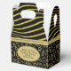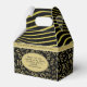 This design is a black and gold random number pattern with milestone number 100 repeated in varied sizes and angles. The top half is wavy stripes.  There is a white band around the top and plaque in the centre for your text.  Use the easy templates to add your own words, name, initial, or monogram.