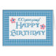 A pretty 100th Birthday Card, with a blue and white check gingham pattern and two pink flowers. You can change the inside greeting if you wish.
