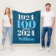 A gorgeous blue typography fleece blanket. This date themed design is the perfect way to wish someone a 'happy 100th birthday'. Personalise with our own custom name. Blue and white typography on a blue background.