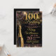A stylish 100th birthday Party Invitation featuring a bottle of bubbly in gold, fireworks with gold and pink text all on a black background . A lovely design inviting your guests to join you for a 100th birthday party celebration. Easy to customize with your own party details. More text can be added on the back or delete the text box if not needed.