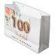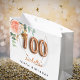 For an elegant and feminine 100th birthday party. A chic white background. Decorated with a rose gold and blush pink watercolored rose flower, floral, green eucalyptus leaves, sprigs, greenery and faux gold sprigs. Personalise and a name. Black and golden letters. The name is written with a modern hand lettered style script. Number 100 is written with a golden balloon style font.