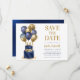 This fabulous men's 100th birthday party Save the Date card featuring a 2-layer navy blue and gold cake with navy blue and gold balloons and the number 100 in gold would be perfect for asking people to put this special date aside for the upcoming 100th Birthday Party. It is traditional and classic while being fresh, modern and contemporary. The back is a coordinating navy blue foil.