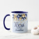 A stylish 100th birthday mug . Design features navy blue and gold balloons, Gold glittery starts and navy blue text all on a pale blue gradient background. A lovely gift for a 100th birthday party celebration. Easy to customize with your own details.
