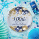 A stylish 100th birthday paper plate . Design features navy blue and gold balloons, Gold glittery starts and navy blue text all on a pale blue gradient background. A lovely party table addition for a 100th birthday party celebration. Easy to customize with your own details.