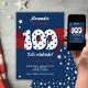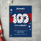 🎂Join us in celebrating a patriotic 100th birthday!🎈 Honour a veteran or military member with this red, white, and blue-themed birthday invitation. The eye-catching design showcases a red ribbon banner set against a background of deep blue, highlighted by a bold white retro number 100 accented with star cutouts. This personalised invitation is perfect for a milestone birthday celebration filled with patriotic pride. Make your loved one feel special with this American-themed party invite! 🇺🇸