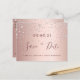 A feminine and glamourous Save the Date card for a 100th birthday party 100 years old. A feminine pink, rose gold faux metallic looking background decorated with faux rose gold diamond sprinkle. Templates for a date and your text. Dark rose gold coloured letters. The text: Save the Date is written with a large trendy hand lettered style script.
