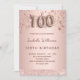 A modern, stylish and glamourous invitation for a 100th birthday party. A faux rose gold metallic looking background with rose gold and pink dripping stars and a glitter band. The name is written with a modern dark rose gold coloured hand lettered style script. Personalise and add your party details. Number 100 is written with a balloon style font, script.
