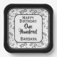 This over-the-hill design has a black and white random number pattern with the centennial milestone number 100 repeated in varied sizes and angles. There is a white rounded square in the centre for your text and black and white around the rim.