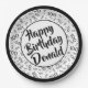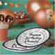 This modern over-the-hill design has a black and white random number pattern with a black milestone number 100 repeated in varied sizes and angles over a white background. There is a white circle in the centre for your text and black-and-white rings around the rim.