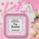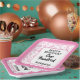 This over-the-hill design has a pink and white random number pattern with the centennial milestone number 100 repeated in varied sizes and angles. There is a white rounded square in the centre for your text and pink and white around the rim.