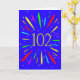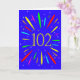 An explosive 102nd birthday card! What a wonderful way to send birthday greetings. The number 102 in bright yellow with an explosion of bright colours and stars.