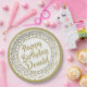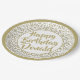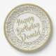 This modern over-the-hill design has a gold and white random number pattern with a gold milestone number 105 repeated in varied sizes and angles over a white background. There is a white circle in the centre for your text and gold-and-white rings around the rim.