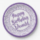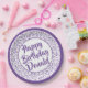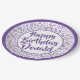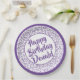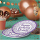 This modern over-the-hill design has a purple and white random number pattern with a purple milestone number 105 repeated in varied sizes and angles over a white background. There is a white circle in the centre for your text and purple-and-white rings around the rim.