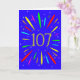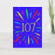 An explosive 107th birthday card! What a wonderful way to send birthday greetings. The number 107 in bright yellow with an explosion of bright colours and stars.