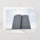Two stone tablets with the ten commandments inscribed on them standing in brown desert sand infront of a blue sky