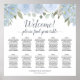 This elegant 10 table wedding seating chart, designed to seat 100 guests with 10 seats per table, showcases a stunning floral design with hand-painted watercolor roses and blossoms in shades of dusty blue, surrounded by sage green leaves and foliage. The title, written in elegant script calligraphy, reads "Welcome! Please find your table" and there is also space for the names of the couple and wedding date at the bottom. This is a fantastic way to greet your guests at your reception and guide them to their designated seating.