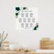 This stunning wedding seating chart includes 10 tables adorned with a rustic floral design featuring delicately hand-painted watercolor roses in shades of emerald green and sage, with accents of lush eucalyptus leaves and garden greenery. The layout accommodates up to 100 guests, with 10 seats available per table. The elegant script calligraphy title reads "please find your table" and the names of the couple and their wedding appear at the bottom. This seating chart is both aesthetically pleasing and functional, making it easy for guests to locate their designated seats while adding to the overall beauty of your wedding reception.