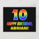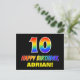 The front of this colourful, fun, and cheerful birthday postcard design features a large number "10" and the message "HAPPY BIRTHDAY,", both coloured with a rainbow spectrum gradient inspired pattern, along with a bold yellow customisable recipient name. The front also features a simple, plain, black coloured background. The back of the postcard has a customisable birthday greeting message, or could perhaps be cleared and left blank if a message is to be written by hand instead. A vibrant customisable birthday postcard like this might be a fun way to send a message celebrating somebody’s tenth birthday. [~Z0000474]
