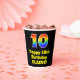 This fun and exciting birthday themed paper cup design features a large number “10” having a rainbow spectrum gradient inspired pattern. It also features the message “Happy 10th Birthday,”, and a custom name. The background is coloured black. Vibrant, colourful paper cups like this might be fun to use at a birthday party/celebration being held to celebrate somebody’s 10th birthday. [~Z0000537]