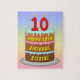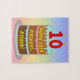 This cheerful and joyful birthday jigsaw puzzle design features a cartoon-style depiction of a three-tier birthday cake having number-shaped candles on top showing the age “10“, along with the message “HAPPY 10TH BIRTHDAY,”, and a personalised recipient name. The background has a multi-colour pastel rainbow spectrum inspired gradient pattern. An upbeat, editable birthday puzzle like this might be used to celebrate somebody’s tenth birthday. [~Z0000621]
