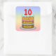 This upbeat and joyful birthday themed square sticker design features a cartoon-style depiction of a three-tier birthday cake having number-shaped candles on top showing the age “10“, along with the message “HAPPY 10TH BIRTHDAY,”, and a custom recipient name. The background has a multi-colour pastel rainbow spectrum inspired gradient pattern. Birthday themed stickers like these might be used or distributed at a party celebrating somebody’s 10th birthday, or perhaps used when preparing invitations or wrapping presents/gifts for such an event. [~Z0000624]