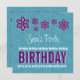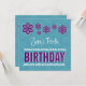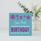 This contemporary design with its purple lace flowers and an aqua background is a fun way to invite folks to a nine year old's birthday party celebration. All text is customisable. You can experiment with different paper types by clicking on the "Invitation Options" tab on the upper right hand corner. I recommend this design on an ice hued metallic paper which gives your invitation a festive shimmer and shine.