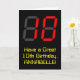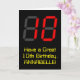 The front of this silly and geeky birthday themed greeting card design features a large number "10" having a red seven segment digital display style appearance, along with the message "Have a Great 10th Birthday," and an editable name, on a black colored background. The inside features a customizable birthday greeting message, or could perhaps be cleared and left blank if a message is to be written by hand instead. A personalized birthday card like this might be a fun way to acknowledge somebody’s tenth birthday. [~Z0000386]