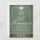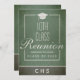 Send your 10th class reunion classmates our elegant flat card invitation. This design template features a green and black shimmery background. The white typography reads "10th Class Reunion" with your school name and year to personalise Below is your school's monogram. The back of the card has more of your celebration details for you to customise. Designed by world renowned artist ©Tim Coffey.