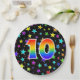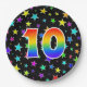 This fun, cheerful, and colourful paper plate design features a large number "10" containing a rainbow spectrum gradient inspired pattern colouring. The background features a colourful star shapes pattern. Fun paper plates like this might be used at a party being held to celebrate somebody’s 10th birthday, or a couple’s tenth anniversary, or some other tenth event. [~Z0000493]