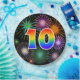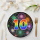 This fun, cheerful, and colourful paper plate design features a large number "10" having a rainbow spectrum gradient inspired pattern colouring. It also features a vibrant and exciting bursting celebratory fireworks inspired pattern. The background is coloured black. Fun paper plates like this might be used at a celebration being held in honour of somebody’s tenth birthday, a tenth anniversary, or some other 10th event. [~Z0000490]