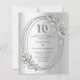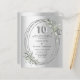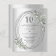A faux silver looking background. Decorated with greenery and an oval frame. Personalise and add a name and details. Number 10 is written with a faux silver looking balloon style font.