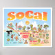 Bright and colourful scene offers a spectacular view of Southern California - wacky characters frolic on the beach and desert of SoCal showcasing Los Angeles, San Diego, Orange County, Santa Barbara, Riverside, Palm Springs, Anza Borrego and Joshua Tree parks as well as the border cities of Tijuana, Tecate and Mexicali. This charming scene has it all – a surfer hangs ten while a killer whale leaps out of the water, zoo animals greet the tourists, a muscular beach couple both flex to impress as a T-Rex roars a challenge and a tank moves into position and much more…