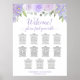 This beautiful 11 table wedding seating chart features a floral boho chic design with hand painted watercolor roses, blossoms, and flowers in shades of dusty purple, lavender, and lilac, along with eucalyptus leaves and garden greenery. The elegant script calligraphy title reads "Welcome! please find your table" and there is space for the couple's and wedding date at the bottom. With table assignments for 110 guests (10 seats per table) this seating chart is a wonderful way to add beauty and style to your wedding reception while making it easy for your guests to find their seats.
