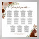 This beautiful 11 table seating chart features a rustic boho chic design with hand painted watercolor roses in autumn shades of coral peach, rust orange, and burnt umber. The flowers are surrounded by eucalyptus leaves and fall garden foliage. Has seating assignments for 110 guests with 10 seats per table, with an elegant script calligraphy title and space for the names of the couple and wedding date below. Wonderful way to make your wedding reception beautiful while making it easy for your guests to find their seats.