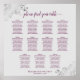 This 11 table seating chart is both simple and elegant with cassis purple or magenta coloured text on a light grey background. The design features a lacy script calligraphy title with decorative frilly silver faux foil filigree in the corners. Stylish, chic and sophisticated way to help your guests find their seats at your wedding reception. It includes table assignments for 110 guests with 10 seats per table.