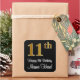 This sophisticated, elegant, and luxurious birthday sticker design features a large ordinal number “11th” having an imitation/faux gold-like look, plus the birthday greeting message “Happy 11th Birthday,” and a personalised name in a script-style font. The background is coloured black. Luxurious stickers like this might be used when wrapping presents being given to somebody in celebration of their 11th birthday, or perhaps may be handed out to the attendees at a birthday party or celebration. [~Z0000517]