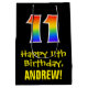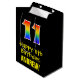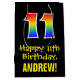 This fun, colourful, and exciting birthday-themed giftbag design features a large number "11" with a rainbow spectrum gradient style pattern, along with the message "Happy 11th Birthday,", and an editable recipient name. It also has a black-coloured background. A gift-bag like this might be a fun way of wrapping a birthday present or gift being given to somebody who is celebrating their eleventh birthday. [~Z0000512]
