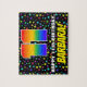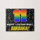 This joyful and bold birthday-themed jigsaw puzzle design features a large number “11” with a multicolored rainbow spectrum inspired gradient pattern, along with the message “HAPPY 11th BIRTHDAY,”, and a personalised recipient name. The background has a fun, multicolored star shapes pattern. A colourful, customised birthday puzzle like this might be used to acknowledge somebody’s eleventh birthday. [~Z0000607]