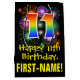 This exciting, colourful, and fun birthday themed giftbag design features a large number "11" with a rainbow spectrum gradient style pattern, along with the message "Happy 11th Birthday,", and an editable recipient name. It also has a colourful bursting celebratory fireworks inspired background pattern. A giftbag like this might be used when wrapping gifts being given to somebody in celebration of their eleventh birthday. [~Z0000509]