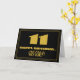 The front of this Roaring Twenties inspired birthday-themed greeting card design features a large art deco look inspired number "11", the message "HAPPY BIRTHDAY,", an editable name, and a border pattern consisting of lines. The front also features a black-coloured background. The inside features a customised birthday greeting message, or could perhaps be cleared and left blank if a message is to be written by hand instead. A personalised birthday card like this might be a fun way to send a message in celebration of somebody’s eleventh birthday. [~Z0000506]